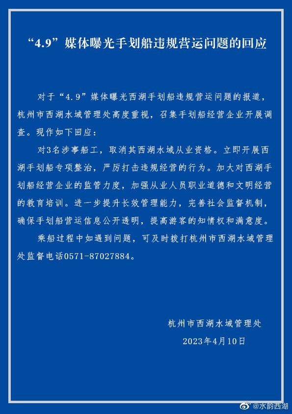 央視網(wǎng)消息:據(jù)@水韻西湖微博消息,對于“4·9”媒體曝光西湖手劃船違規(guī)營運問題的報道,杭州西湖水域管理處高度重視,召集手劃船經(jīng)營企業(yè)開展調(diào)查。現(xiàn)作如下回應(yīng):