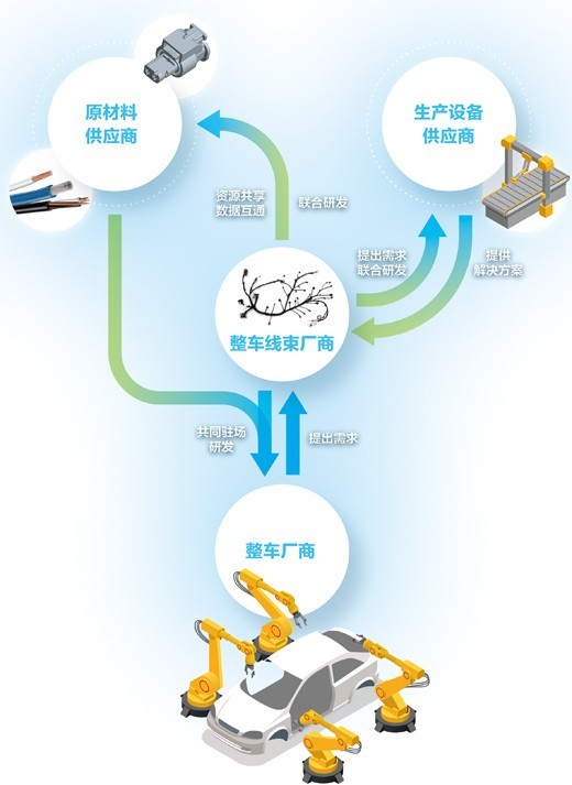 以汽車(chē)電路的主體——整車(chē)線束為例,僅圍繞一家龍頭民營(yíng)企業(yè),就有近50家供應(yīng)商聚集昆山,在這條成熟的產(chǎn)業(yè)鏈上,上下游分工明確,供需合作緊密。