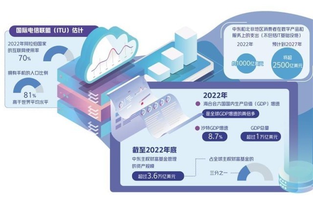 其次,中東消費(fèi)者對(duì)互聯(lián)網(wǎng)、大數(shù)據(jù)、金融科技、新能源等高科技產(chǎn)品和服務(wù)有著旺盛需求,而且有較高的收入水平和支付能力。據(jù)國際電信聯(lián)盟(ITU)估計(jì),2022年阿拉伯國家的互聯(lián)網(wǎng)使用率達(dá)70%,擁有手機(jī)的人口比例為81%,高于世界平均水平(73%)。據(jù)估計(jì),2022年,中東和北非地區(qū)消費(fèi)者在數(shù)字產(chǎn)品和服務(wù)上的支出(不包括IT基礎(chǔ)設(shè)施)約為1000億美元,預(yù)計(jì)到2027年將超過2500億美元。