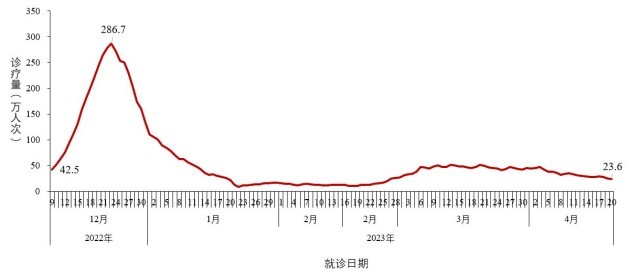?。ㄒ唬┛傮w就診人數(shù)結果。全國(不含港澳臺)發(fā)熱門診(診室)就診人數(shù)于2022年12月23日達到峰值286.7萬人次,隨后連續(xù)下降;2023年1月23日后就診人數(shù)呈現(xiàn)低位波動,約6周(2月24日-4月6日)的波動增加及平臺波動后,近2周(4月7日-4月20日)呈下降趨勢,4月20日為23.6萬人次,較峰值下降了91.8%(圖2-1)。