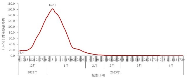 ?。ㄒ唬┰谠盒鹿诓《靖腥菊呓Y果。全國在院新冠病毒感染者于2023年1月5日達到峰值162.5萬人,隨后持續(xù)下降;4月20日下降至3929例,較峰值減少了99.8%(圖3-1)。