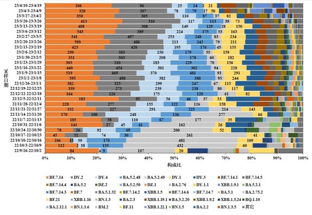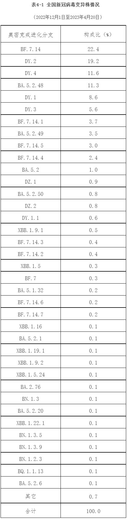 ?。ǘ?2月以來本土病例病毒變異株監(jiān)測情況。2022年12月1日至2023年4月20日,全國共報送32993例本土病例新冠病毒基因組有效序列,均為奧密克戎變異株,涵蓋117個進化分支。主要流行株為BA.5.2及其亞分支(構成比64.3%)和BF.7及其亞分支(構成比33.0%)等。其中,BA.5.2及其亞分支包括DY.2(19.2%)、DY.4(11.6%)、BA.5.2.48(11.3%)、DY.1(8.6%)、DY.3(5.6%)和BA.5.2.49(3.5%)等;BF.7及其亞分支包括BF.7.14(22.4%)、BF.7.14.1(3.7%)、BF.7.14.5(3.0%)、BF.7.14.4(2.4%)、BF.7.14.3(0.4%)和BF.7.14.2(0.3%)等(表4-1)。共監(jiān)測到本土重點關注變異株603例,其中,4例BQ.1、4例BQ.1.1、19例BQ.1.1.13、1例BQ.1.1.17、1例BQ.1.1.18、1例BQ.1.1.35、1例BQ.1.1.38、1例BQ.1.1.46、1例BQ.1.1.53、2例BQ.1.1.66、1例BQ.1.1.69、8例BQ.1.2、1例BQ.1.23、2例BQ.1.8、2例CH.1.1、3例CH.1.1.1、1例CH.1.1.11、1例DT.2、1例EA.1、2例EG.1、3例EL.1、7例EM.1、1例EU.1.1、2例FB.1、3例FE.1、1例XBB、4例XBB.1、2例XBB.1.11.1、1例XBB.1.12、4例XBB.1.15、42例XBB.1.16、5例XBB.1.16.1、16例XBB.1.17.1、37例XBB.1.19.1、2例XBB.1.22、22例XBB.1.22.1、1例XBB.1.23、5例XBB.1.24、1例XBB.1.4、109例XBB.1.5、2例XBB.1.5.11、9例XBB.1.5.12、2例XBB.1.5.15、7例XBB.1.5.23、35例XBB.1.5.24、1例XBB.1.5.28、1例XBB.1.5.32、1例XBB.1.5.36、1例XBB.1.5.5、2例XBB.1.5.7、2例XBB.1.9、163例XBB.1.9.1、35例XBB.1.9.2、1例XBB.1.9.3、1例XBB.1.9.5、11例XBB.2.3、1例XBB.2.3.2、1例XBB.2.4和2例XBB.3。