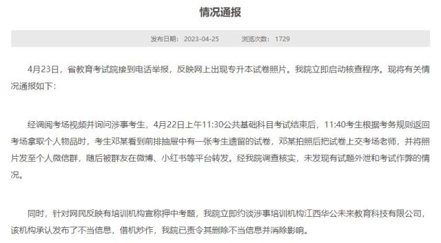 經調閱考場視頻并詢問涉事考生,4月22日上午11:30公共基礎科目考試結束后,11:40考生根據考務規(guī)則返回考場拿取個人物品時,考生鄧某看到前排抽屜中有一張考生遺留的試卷,鄧某拍照后把試卷上交考場老師,并將照片發(fā)至個人微信群,隨后被群友在微博、小紅書等平臺轉發(fā)。經江西省教育考試院調查核實,未發(fā)現(xiàn)有試題外泄和考試作弊的情況。