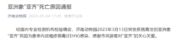 濟(jì)南動(dòng)物園通報(bào)亞洲象“亞齊”死亡原因