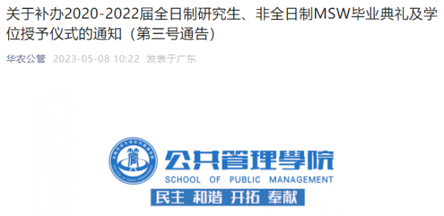 5月8日,華南農(nóng)業(yè)大學(xué)公共管理學(xué)院發(fā)布通知,決定為2020-2022屆全日制研究生、非全日制MSW補(bǔ)辦畢業(yè)典禮及學(xué)位授予儀式,畢業(yè)典禮及學(xué)位授予儀式以預(yù)約方式報名參加,時間定于5月20日(周六)。