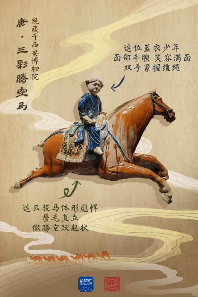 1000多年前,一位來自西域的“藍(lán)衣少年”,穿過茫茫戈壁、廣袤沙漠,抵達(dá)長安。這位“藍(lán)衣少年”,是西安博物院“明星”藏品——唐代三彩騰空馬之上的騎手?!八?,也見證了這場跨越千年的文明交融。