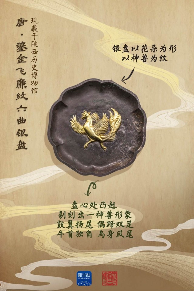 1970年10月,在西安市南郊何家村的工地上,施工人員偶然發(fā)現(xiàn)了一處文物窖藏,隨后在這里清理出千余件唐代珍寶。這件鎏金飛廉紋六曲銀盤制作考究、工藝典雅、紋飾獨(dú)特,盤心的神獸形象為飛廉,是中國古代神話傳說中的風(fēng)神。這件銀盤構(gòu)圖借鑒了中亞粟特的藝術(shù)手法,但題材卻是中國紋樣,反映出唐代工匠在借鑒西方金銀器藝術(shù)的基礎(chǔ)上,更加注重推陳出新。