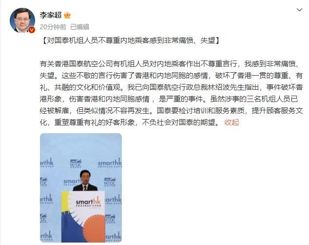 李家超表示,他已向國泰航空行政總裁林紹波提出,此次事件屬于嚴(yán)重事件,國泰航空需進行檢討,類似情況不容再次發(fā)生。