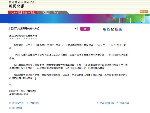 香港運輸及物流局局長林世雄23日晚間發(fā)布聲明表示,十分痛心國泰航空公司部分機組人員的不當(dāng)言論,事件嚴(yán)重違背香港優(yōu)良的待客之道、一貫的價值觀和道德標(biāo)準(zhǔn)。