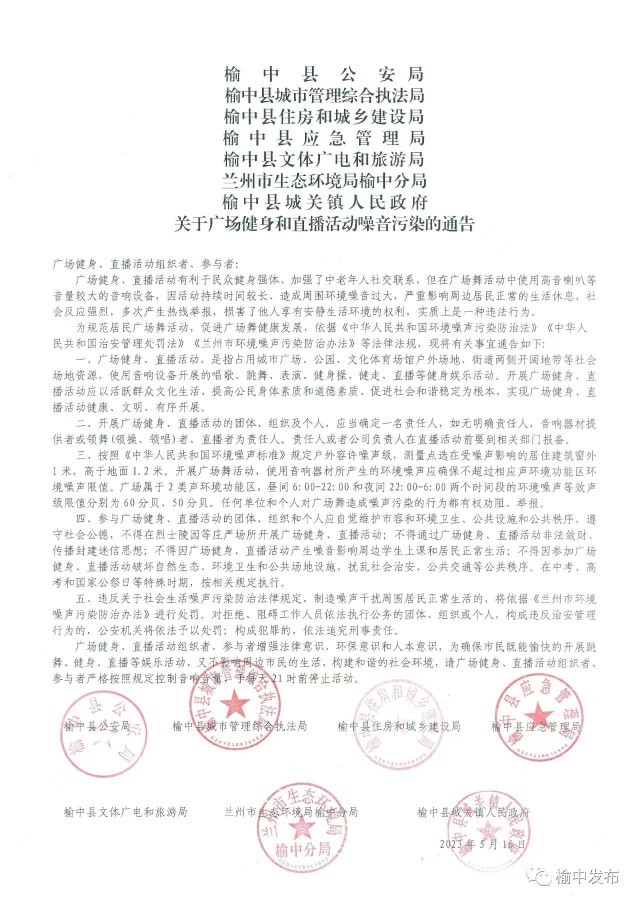 日前,蘭州市榆中縣公安局、榆中縣城市管理綜合執(zhí)法局等單位聯(lián)合發(fā)布《關(guān)于廣場健身和直播活動(dòng)噪音污染的通告》(以下簡稱《通告》),其中明確,當(dāng)?shù)貜V場健身、直播活動(dòng)組織者參與者嚴(yán)格按照規(guī)定控制音響音量,于每天21時(shí)前停止活動(dòng)。