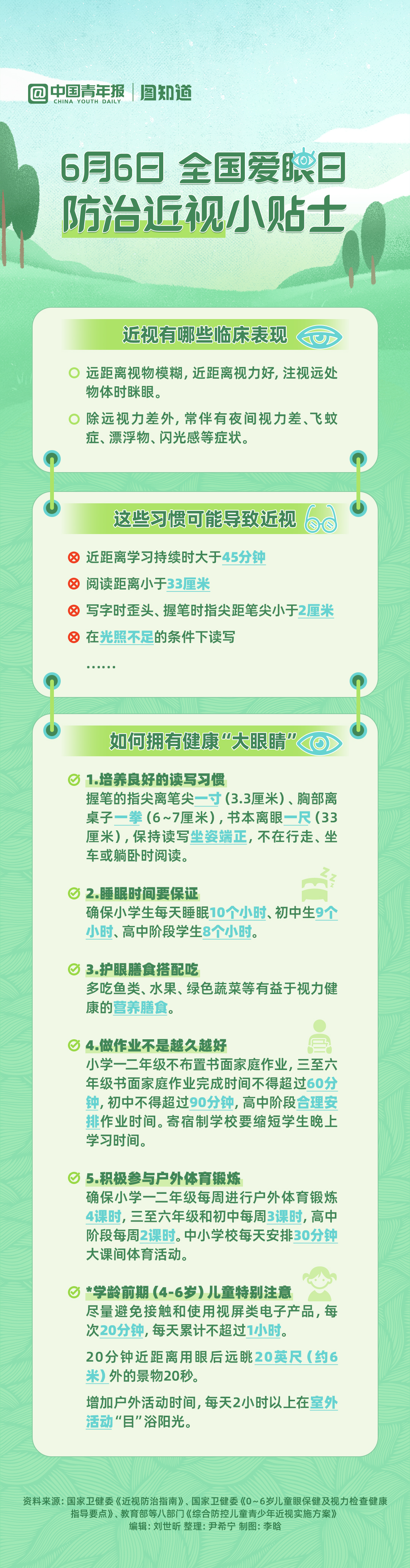 資料來(lái)源:國(guó)家衛(wèi)健委《近視防治指南》、國(guó)家衛(wèi)健委《0~6歲兒童眼保健及視力檢查健康指導(dǎo)要點(diǎn)》、教育部等八部門(mén)《綜合防控兒童青少年近視實(shí)施方案》