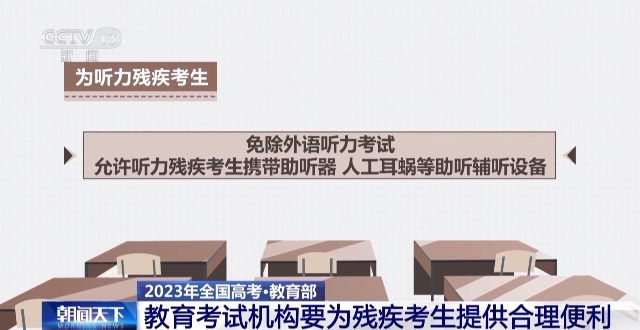 為聽力殘疾考生免除外語聽力考試。允許聽力殘疾考生攜帶助聽器、人工耳蝸等助聽輔聽設(shè)備。
