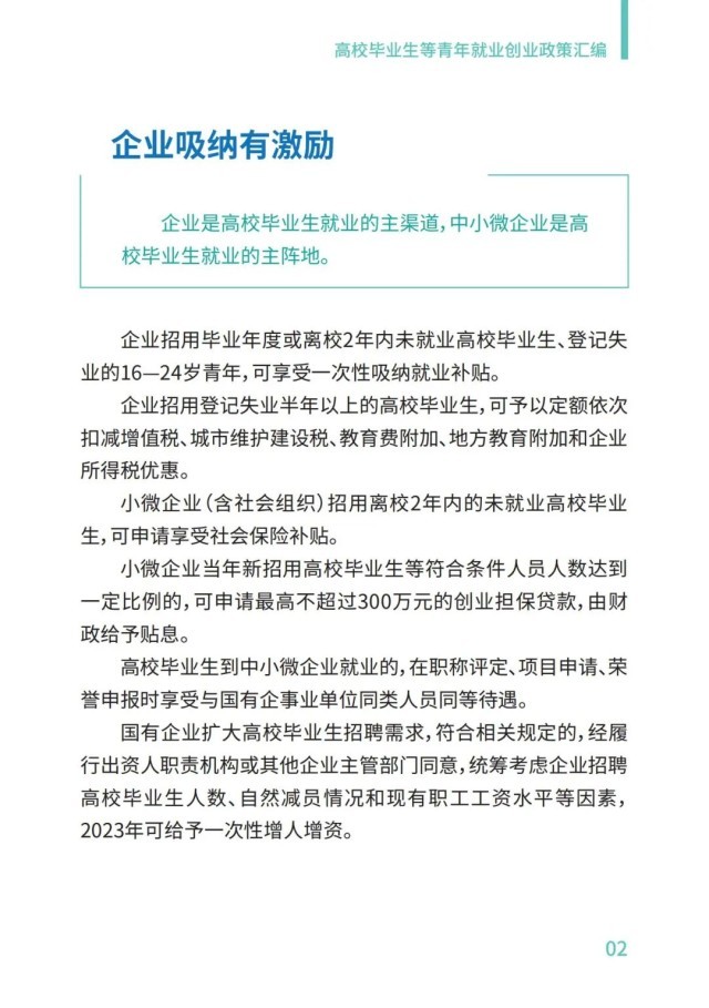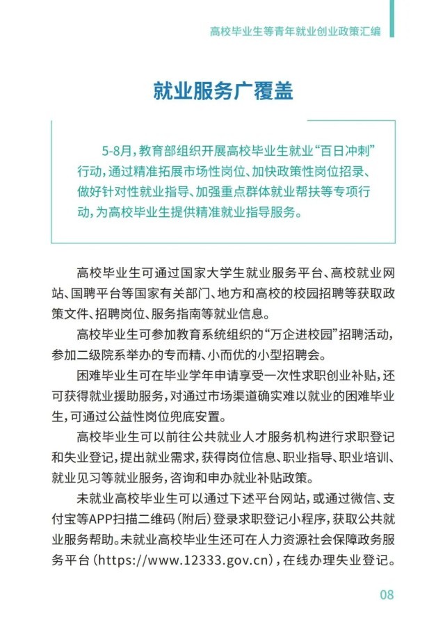《匯編》系統(tǒng)梳理了國家有關部門出臺的促進高校畢業(yè)生就業(yè)創(chuàng)業(yè)現(xiàn)行政策,聚焦高校畢業(yè)生求職就業(yè)需求,分為企業(yè)就業(yè)、基層就業(yè)、自主創(chuàng)業(yè)、能力提升、應征入伍、就業(yè)見習、就業(yè)服務、就業(yè)手續(xù)、權益維護等九方面內容。為便于高校畢業(yè)生和企業(yè)快速查閱相關政策,《匯編》還歸納整理了就業(yè)有關政策清單,包括6項面向企業(yè)(單位)吸納高校畢業(yè)生就業(yè)的補貼、稅收優(yōu)惠等政策,以及9項面向高校畢業(yè)生的補貼、資助等政策。
