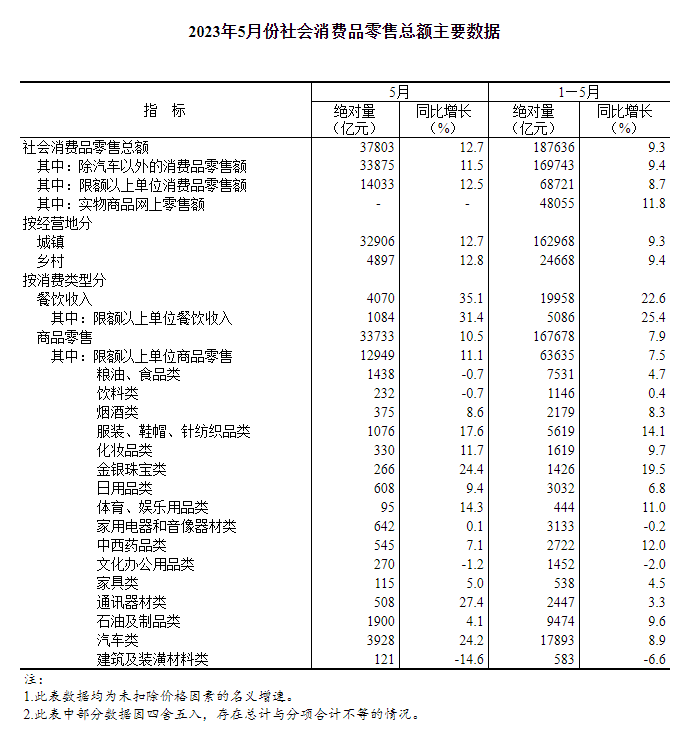 國家統(tǒng)計局公布數(shù)據(jù),5月份,社會消費(fèi)品零售總額37803億元,同比增長12.7%。其中,除汽車以外的消費(fèi)品零售額33875億元,增長11.5%。