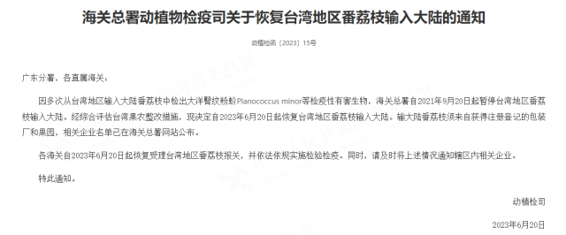 各海關自2023年6月20日起恢復受理臺灣地區(qū)番荔枝報關,并依法依規(guī)實施檢驗檢疫。同時,請及時將上述情況通知轄區(qū)內相關企業(yè)。