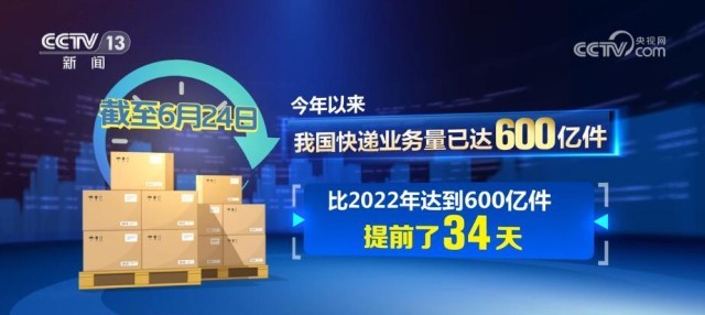 國(guó)家郵政局?jǐn)?shù)據(jù)顯示,截至6月24日,今年以來我國(guó)快遞業(yè)務(wù)量已達(dá)600億件,比2022年達(dá)到600億件提前了34天。