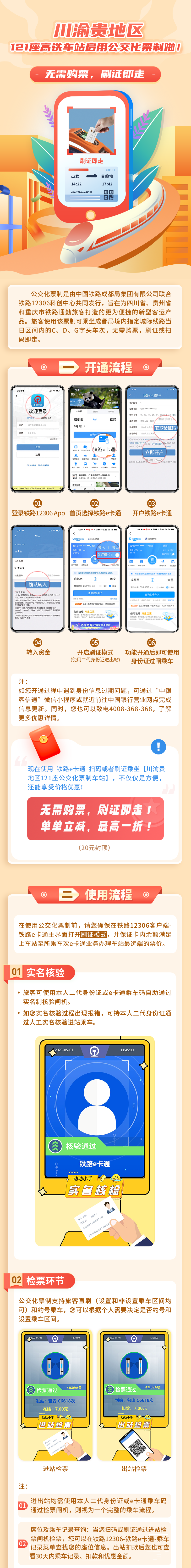 為進一步提升通勤旅客出行體驗,中國鐵路成都局集團有限公司管內(nèi)的川渝貴地區(qū)121座高鐵車站啟用公交化票制。已開通鐵路e卡通的旅客在鐵路12306客戶端-鐵路e卡通主頁,啟用刷證模式,即可使用二代身份證或e卡通乘車碼,實現(xiàn)無需購票,刷證或掃碼即走。