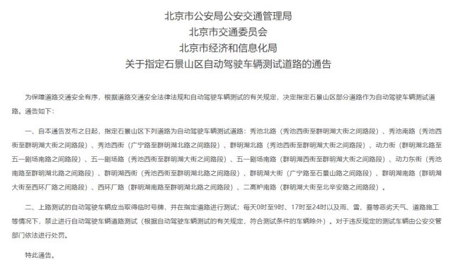 為保障道路交通安全有序,根據(jù)道路交通安全法律法規(guī)和自動(dòng)駕駛車(chē)輛測(cè)試的有關(guān)規(guī)定,決定指定石景山區(qū)部分道路作為自動(dòng)駕駛車(chē)輛測(cè)試道路。