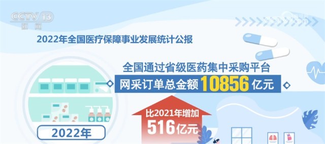 在藥品和耗材集采方面,2022年,第七批國家組織藥品集中帶量采購涉及61個(gè)品種,平均降價(jià)48%。國家組織骨科脊柱類高值醫(yī)用耗材集采納入5種脊柱類骨科耗材,平均降幅84%。根據(jù)公報(bào),2022年,全國通過省級(jí)醫(yī)藥集中采購平臺(tái)網(wǎng)采訂單總金額10856億元,比2021年增加516億元。其中,西藥(化學(xué)藥及生物制品)8810億元,中成藥2046億元,分別比2021年增加495億元和21億元。群眾用上了更多質(zhì)優(yōu)價(jià)宜的藥品和耗材。