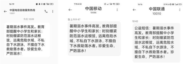 中國青年報(bào)客戶端北京7月13日電(中青報(bào)·中青網(wǎng)記者 樊未晨)記者今天從教育部獲悉,暑假來臨,教育部、工信部協(xié)調(diào)中國電信、中國移動(dòng)、中國聯(lián)通三大運(yùn)營商,向全國手機(jī)用戶發(fā)送了暑期防溺水公益短信,提醒廣大中小學(xué)生和家長增強(qiáng)安全意識(shí),營造全社會(huì)關(guān)心支持預(yù)防學(xué)生溺水工作良好氛圍。