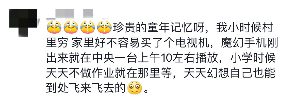 一名網(wǎng)友稱《魔幻手機(jī)》是自己珍貴的童年記憶,當(dāng)年家里好不容易買了電視機(jī),小學(xué)時(shí)天天守在電視機(jī)前等待播出,“天天幻想自己也能到處飛來飛去”。