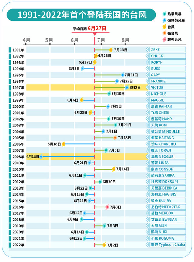 1991-2022年首個登陸我國的臺風(fēng)名稱、登陸日期及登陸時強(qiáng)度 丁茜制圖