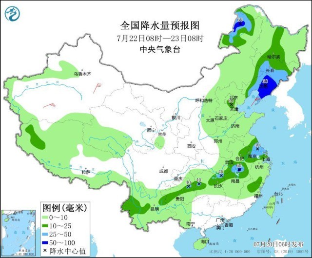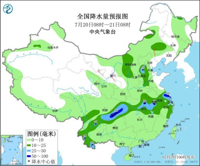 圖1 全國降水量預(yù)報圖(7月20日08時-21日08時)