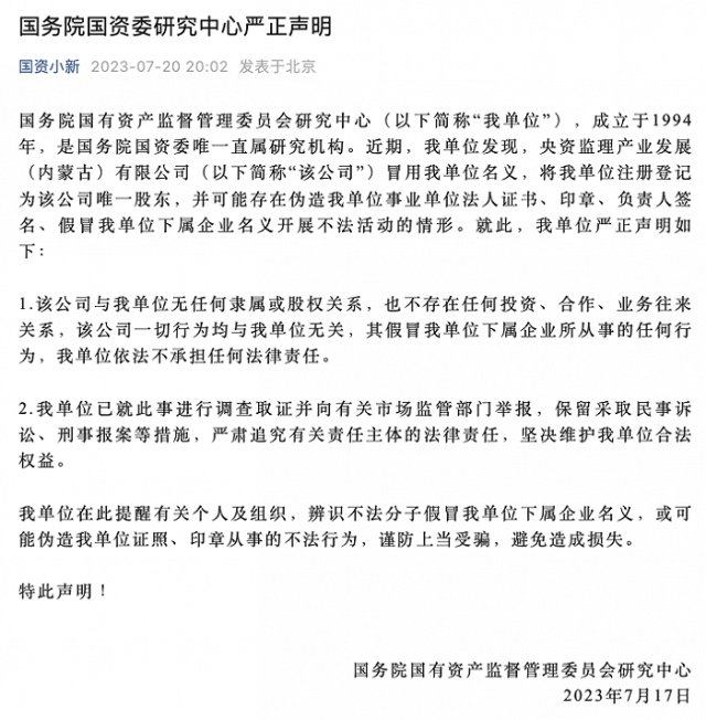 國務(wù)院國資委研究中心:一公司冒用我單位名義或開展不法活動,已調(diào)查取證并舉報