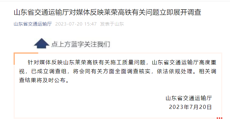 針對媒體反映山東萊榮高鐵有關施工質量問題,山東省交通運輸廳高度重視,已成立調查組,將會同有關方面全面調查核實,依法依規(guī)處理。相關調查結果將及時公布。