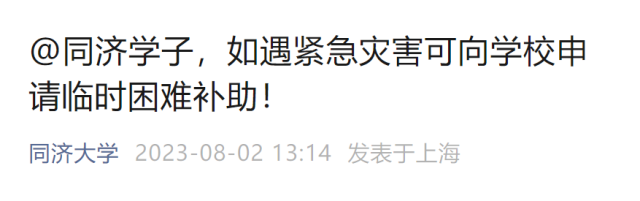 為積極應(yīng)對(duì)并及時(shí)為同濟(jì)學(xué)子提供關(guān)心和幫扶,學(xué)校設(shè)立同濟(jì)大學(xué)2023年暑期受災(zāi)地區(qū)學(xué)生專項(xiàng)補(bǔ)貼(含2023級(jí)錄取新生),如你及你的家庭遇到各類緊急災(zāi)害、突發(fā)事件(不限于臺(tái)風(fēng)災(zāi)害),請(qǐng)及時(shí)聯(lián)系所在學(xué)院的輔導(dǎo)員說明情況,提出緊急災(zāi)害專項(xiàng)救助申請(qǐng)。