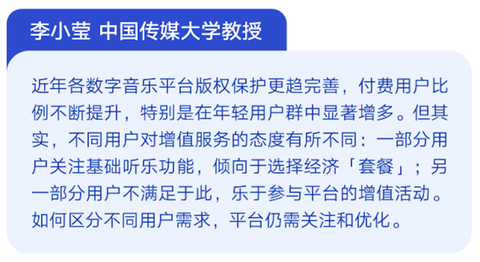 “近年各數(shù)字音樂平臺(tái)版權(quán)保護(hù)更趨完善,付費(fèi)用戶比例不斷提升,特別是在年輕用戶群中顯著增多”,中國(guó)傳媒大學(xué)教授李小瑩指出,不同用戶對(duì)增值服務(wù)的態(tài)度有所不同:一部分用戶關(guān)注基礎(chǔ)聽樂功能,傾向于選擇經(jīng)濟(jì)“套餐”;另一部分用戶不滿足于此,樂于參與平臺(tái)的增值活動(dòng)。