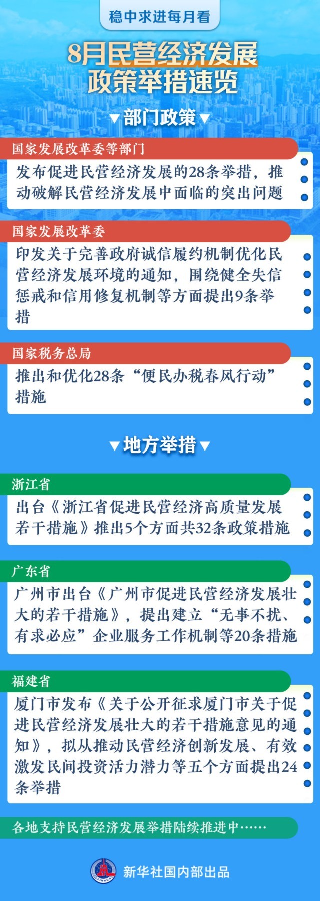 浙江省出臺促進(jìn)民營經(jīng)濟(jì)高質(zhì)量發(fā)展32條措施,提出向民營企業(yè)推介“三張項目清單”,為民間資本更好了解和參與重大項目提供平臺;廣州市出臺促進(jìn)民營經(jīng)濟(jì)發(fā)展壯大的20條措施,提出建立“無事不擾、有求必應(yīng)”企業(yè)服務(wù)工作機(jī)制等;深圳市針對備受民營企業(yè)關(guān)注的放寬市場準(zhǔn)入、保護(hù)合法權(quán)益、清理拖欠企業(yè)賬款等方面,提出20條精準(zhǔn)有力舉措……