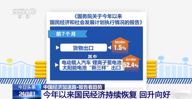 報告指出,前7個月貨物出口同比增長1.5%,其中電動載人汽車、鋰離子蓄電池、太陽能電池“新三樣”出口合計增長52.4%。知識密集型服務貿(mào)易較快增長,旅行服務貿(mào)易明顯恢復,上半年服務進出口同比增長8.5%。推動外資標志性項目落地實施,外貿(mào)外資平穩(wěn)發(fā)展。