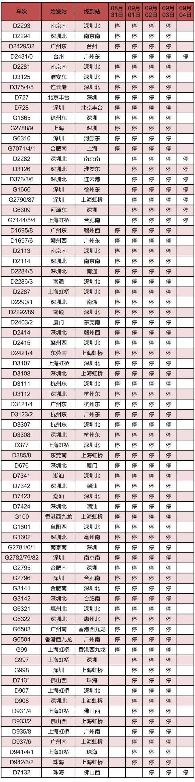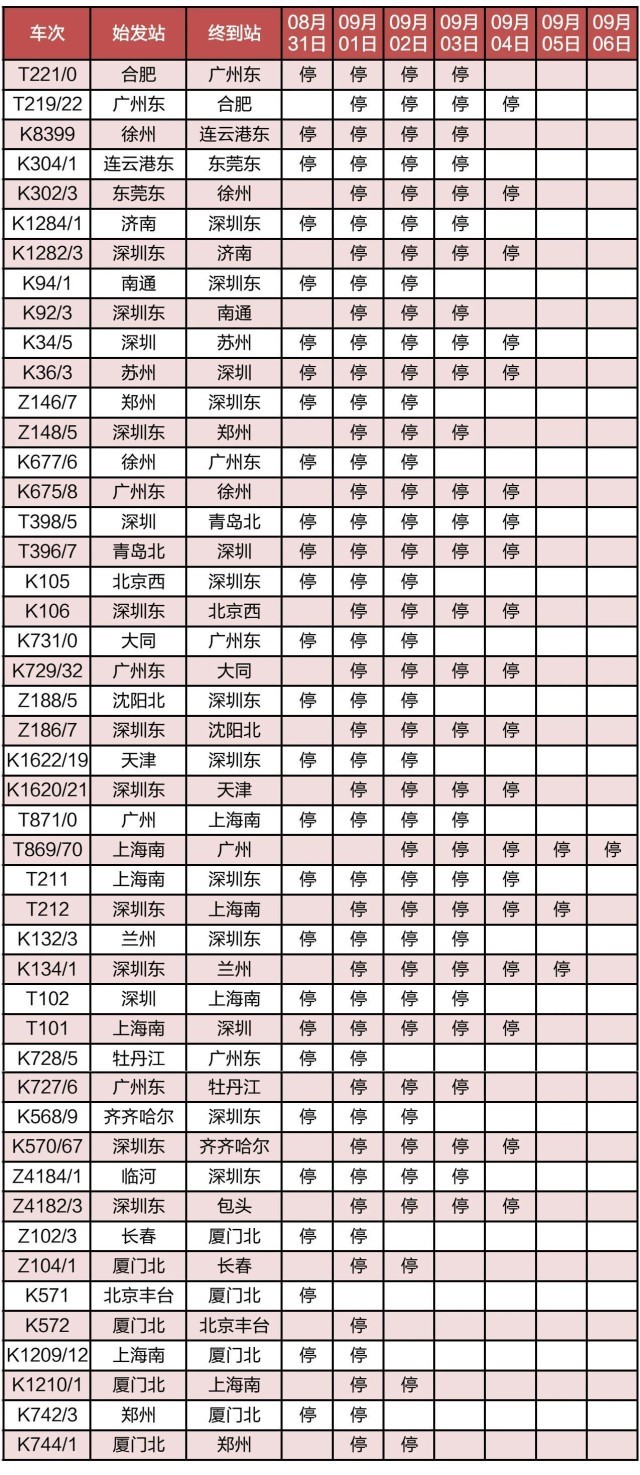 “長(zhǎng)三角鐵路”消息:受第9號(hào)臺(tái)風(fēng)“蘇拉”影響,為確保列車運(yùn)行安全,鐵路部門計(jì)劃對(duì)杭深線、京港高鐵、廣深城際、廣深港高鐵、穗深城際、京九線等線路運(yùn)行的部分列車采取停運(yùn)措施,計(jì)劃停運(yùn)8月31日至9月6日間共121趟旅客列車:其中停運(yùn)動(dòng)車組列車74趟,停運(yùn)普速列車47趟。(停運(yùn)列車車次信息見附表)