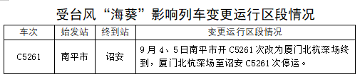 據(jù)中央氣象臺(tái)消息,今年第11號(hào)臺(tái)風(fēng)“??睂⒂?日凌晨到上午在福建漳浦至廣東惠來(lái)一帶沿海登陸,福建東部部分地區(qū)可能有大到暴雨,福建東南部部分地區(qū)有大暴雨,局地特大暴雨。為防范臺(tái)風(fēng)影響,保障運(yùn)輸安全,中國(guó)鐵路南昌局集團(tuán)有限公司調(diào)整部分旅客列車(chē)運(yùn)行方案,停運(yùn)途經(jīng)杭深線(xiàn)管內(nèi)漳州(不含)至詔安區(qū)段旅客列車(chē)。