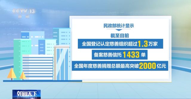 民政部統(tǒng)計(jì)顯示,截至目前,全國(guó)登記認(rèn)定慈善組織超過(guò)1.3萬(wàn)家;備案慈善信托1433單;全國(guó)年度慈善捐贈(zèng)總額最高突破2000億元。