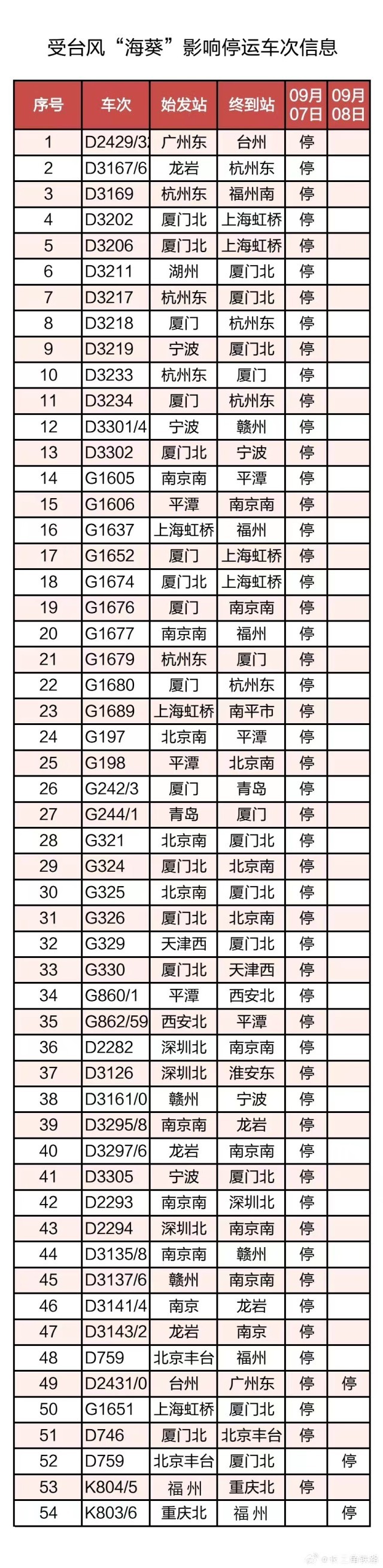 截至9月6日22時(shí),計(jì)劃停運(yùn)9月7日至9月8日間共54趟旅客列車:其中停運(yùn)動(dòng)車組列車52趟,停運(yùn)普速列車2趟。