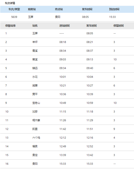 5640/5639次列車開行于貴陽和玉屏之間,中間途經(jīng)大大小小14個(gè)站——羊坪、青溪、蕉溪、鎮(zhèn)遠(yuǎn)、水花、施秉、黃平、寶老山、加勞、桐木寨、凱里、六個(gè)雞、福泉、貴定。
