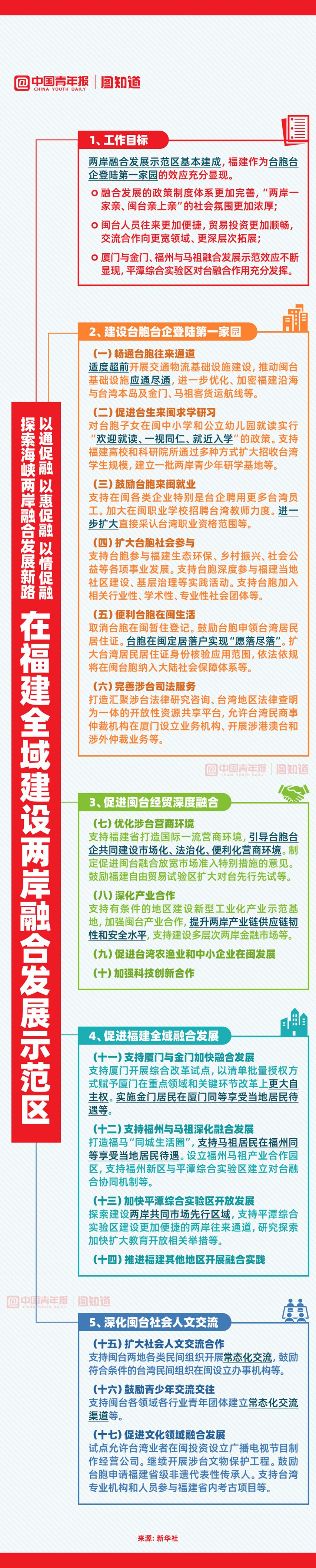 為深化兩岸各領域融合發(fā)展,推進祖國和平統(tǒng)一進程,中共中央、國務院近日印發(fā)《關于支持福建探索海峽兩岸融合發(fā)展新路 建設兩岸融合發(fā)展示范區(qū)的意見》,以通促融、以惠促融、以情促融,有哪些最新措施,一圖了解收藏。