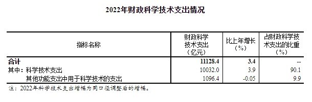 2022年,國家財政科學技術支出11128.4億元,比上年增加361.7億元,增長3.4%。其中,中央財政科技支出3803.4億元,占全國財政科技支出的比重為34.2%;地方財政科技支出7325.0億元,占比為65.8%。