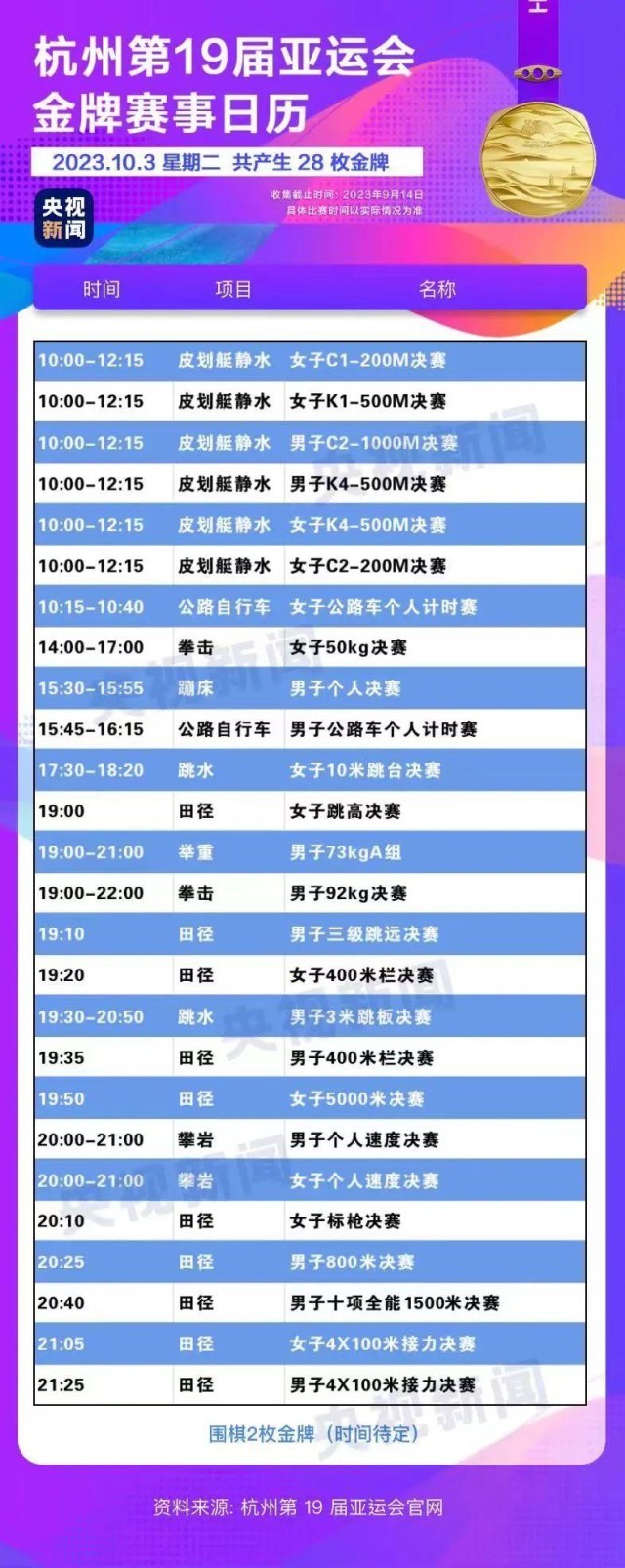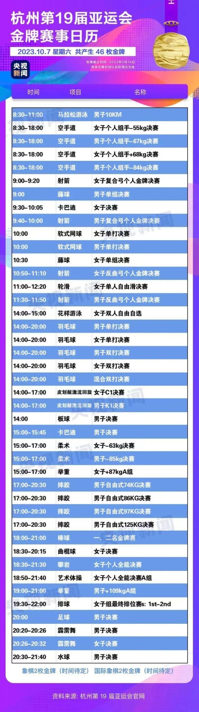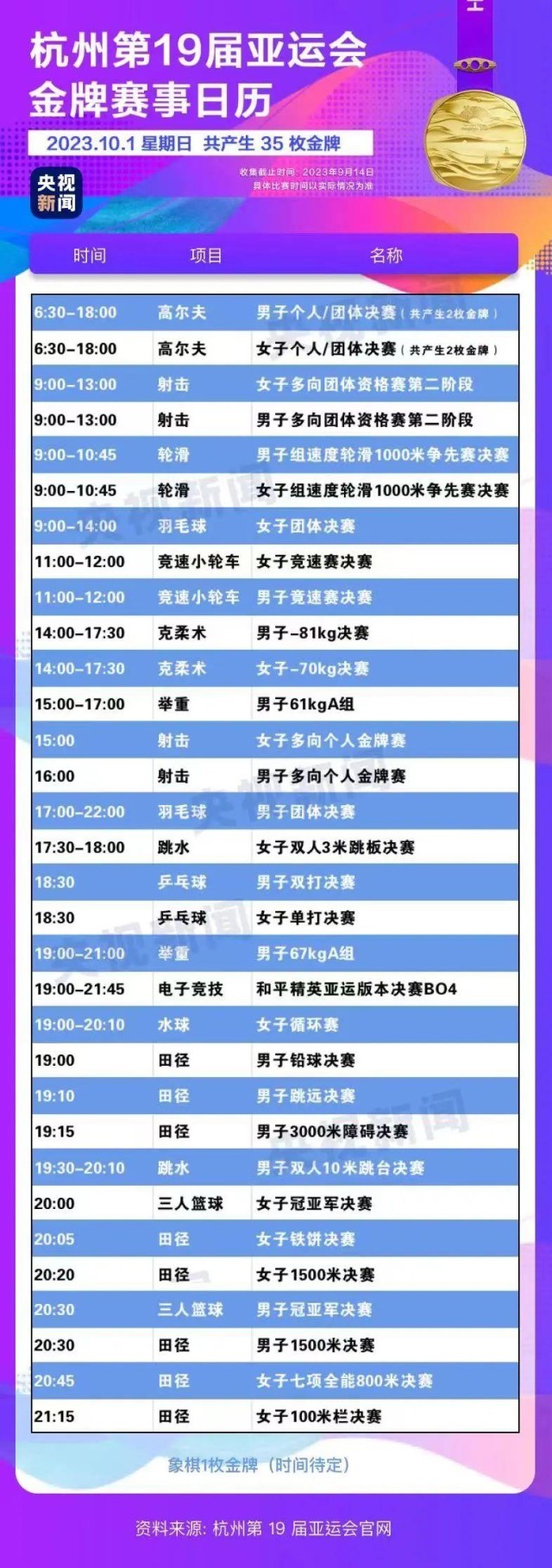最后,小編還為你準備了一份杭州亞運會金牌賽事日歷,日歷里包含所有481枚金牌產(chǎn)生的時間?;瑒邮种福纯茨汴P(guān)注的比賽在哪天舉行。