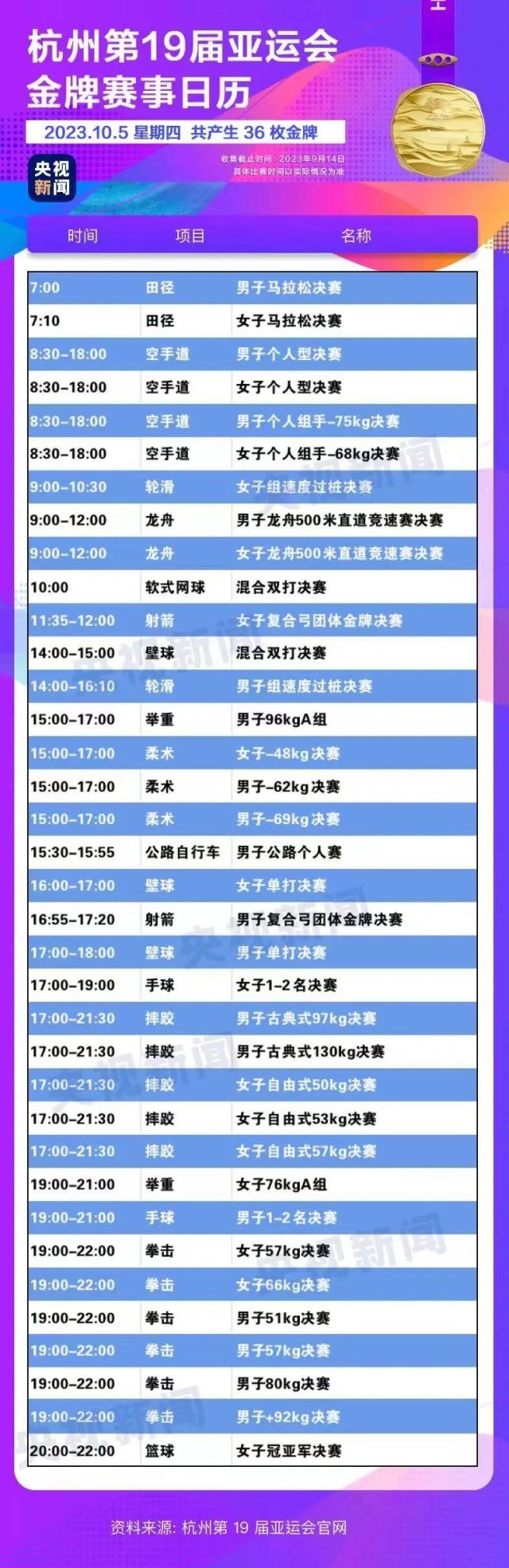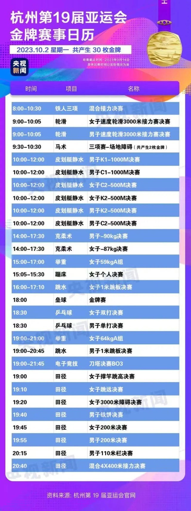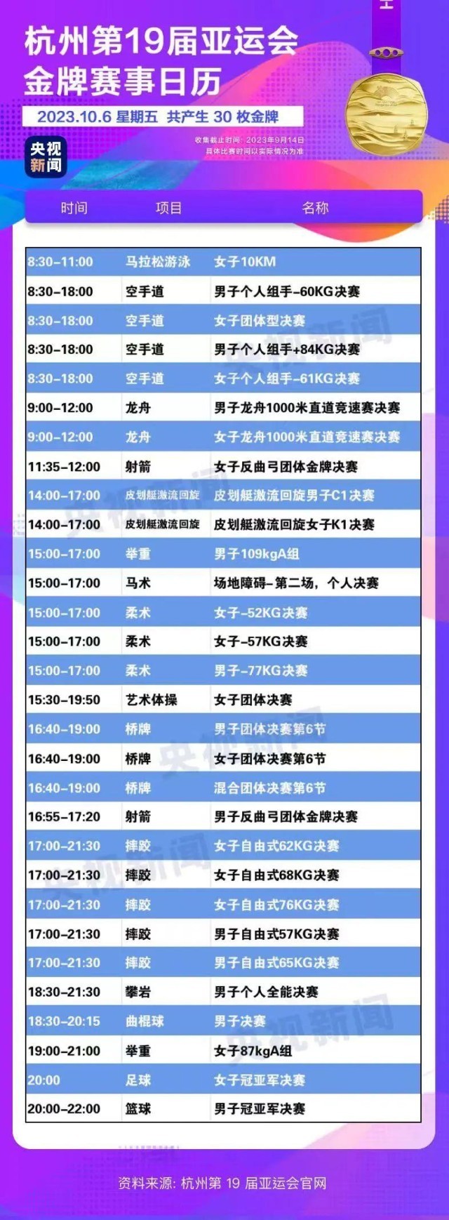 最后,小編還為你準備了一份杭州亞運會金牌賽事日歷,日歷里包含所有481枚金牌產(chǎn)生的時間?;瑒邮种福纯茨汴P(guān)注的比賽在哪天舉行。