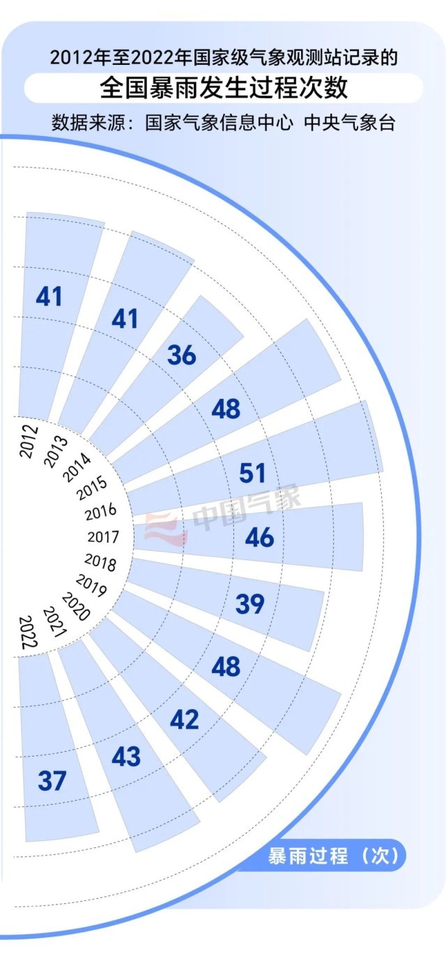 我們通過數(shù)據(jù)了解下我國近年來的暴雨發(fā)生頻次。2012年至2022年間,我國共發(fā)生暴雨天氣過程472次,年均發(fā)生次數(shù)約為42.9次;2016年暴雨發(fā)生次數(shù)最多,為51次;2014年最少,為36次(2023年未結(jié)束,暫不計)。