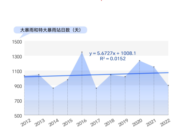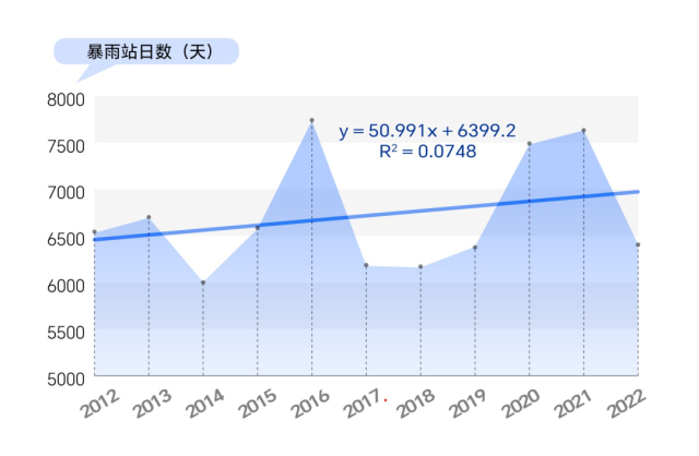 數(shù)據(jù)統(tǒng)計顯示,2012年至2022年,我國暴雨站日數(shù)有明顯的增加趨勢。這意味著,2012年到2022年,我國暴雨天氣過程的持續(xù)時間或影響范圍有增加(擴(kuò)大)的趨勢。