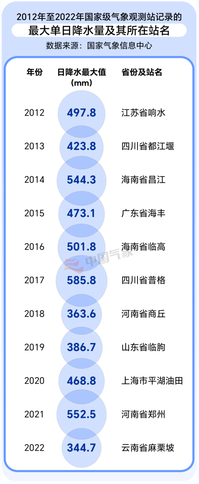 那么,近年來的單日最大降水量又是如何變化的呢?據(jù)國家氣象信息中心數(shù)據(jù)顯示,2012年至2022年,我國日降水量最大值分別出現(xiàn)在江蘇響水、四川都江堰、海南昌江、廣東海豐、海南臨高、四川普格、山東臨朐、上海平湖油田、河南鄭州、云南麻栗坡。