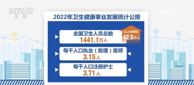 《公報(bào)》顯示,我國醫(yī)療衛(wèi)生資源總量繼續(xù)增加。到2022年末,全國醫(yī)療衛(wèi)生機(jī)構(gòu)達(dá)到1032918個,比上年增加1983個。全國共設(shè)置13個類別的國家醫(yī)學(xué)中心和兒童類別的國家區(qū)域醫(yī)療中心。全國醫(yī)療衛(wèi)生機(jī)構(gòu)床位975.0萬張,每千人口醫(yī)療衛(wèi)生機(jī)構(gòu)床位數(shù)由2021年的6.70張?jiān)黾拥?022年的6.92張。全國衛(wèi)生人員總數(shù)1441.1萬人,比上年增加42.5萬人。每千人口執(zhí)業(yè)(助理)醫(yī)師3.15人,每千人口注冊護(hù)士3.71人。