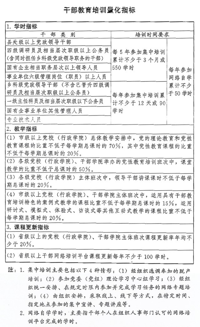 ?。ǘ熧Y隊(duì)伍建設(shè)。加大名師培養(yǎng)引進(jìn)力度,把干部教育培訓(xùn)師資納入各級(jí)人才政策支持范疇,努力造就一批對(duì)黨忠誠(chéng)、精通黨的創(chuàng)新理論、授課水平高、在學(xué)科領(lǐng)域有影響力的知名教師。完善專職教師知識(shí)更新和實(shí)踐鍛煉制度,加強(qiáng)師資隊(duì)伍黨性教育和業(yè)務(wù)培訓(xùn),國(guó)家級(jí)干部教育培訓(xùn)機(jī)構(gòu)每年培訓(xùn)2000名地方和部門行業(yè)培訓(xùn)機(jī)構(gòu)的骨干教師,省級(jí)黨校(行政學(xué)院)5年內(nèi)將市、縣兩級(jí)黨校(行政學(xué)院)教師培訓(xùn)一遍。鼓勵(lì)國(guó)家級(jí)干部教育培訓(xùn)機(jī)構(gòu)和省、市兩級(jí)黨校(行政學(xué)院)教師到基層黨校(行政學(xué)校)、省(自治區(qū)、直轄市)黨性教育干部學(xué)院支教。評(píng)聘干部教育名師,推廣“名師帶徒”等方式,利用“名師工作室”等平臺(tái),加強(qiáng)中青年骨干教師培養(yǎng)。大力推進(jìn)領(lǐng)導(dǎo)干部上講臺(tái)。注重在領(lǐng)導(dǎo)干部、先進(jìn)模范人物、優(yōu)秀基層干部中遴選培養(yǎng)師資。分級(jí)建設(shè)師資庫。探索建立符合干部教育培訓(xùn)特點(diǎn)的師資隊(duì)伍考核評(píng)價(jià)體系和職稱評(píng)審制度。