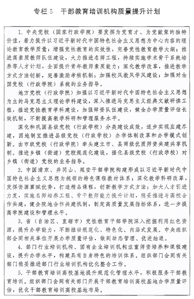 ?。ㄒ唬┡嘤?xùn)機(jī)構(gòu)建設(shè)。推進(jìn)各級(jí)黨校(行政學(xué)院)建設(shè),以教學(xué)督導(dǎo)、師資培養(yǎng)、質(zhì)量評(píng)估為重點(diǎn),強(qiáng)化上級(jí)黨校(行政學(xué)院)對(duì)下級(jí)黨校(行政學(xué)院)的業(yè)務(wù)指導(dǎo),不斷提高辦學(xué)水平。推進(jìn)縣級(jí)黨校(行政學(xué)校)分類建設(shè)。加強(qiáng)社會(huì)主義學(xué)院建設(shè)。進(jìn)一步提升部門行業(yè)培訓(xùn)機(jī)構(gòu)、國(guó)有企業(yè)培訓(xùn)機(jī)構(gòu)辦學(xué)質(zhì)量。加強(qiáng)對(duì)干部教育培訓(xùn)高?;亍⒒鶎痈刹拷逃嘤?xùn)機(jī)構(gòu)辦學(xué)指導(dǎo)。開展黨校(行政學(xué)院)、?。ㄗ灾螀^(qū)、直轄市)黨性教育干部學(xué)院、干部教育培訓(xùn)高?;剞k學(xué)質(zhì)量評(píng)估。加強(qiáng)各類黨員干部教育培訓(xùn)機(jī)構(gòu)規(guī)范管理,嚴(yán)控新設(shè)以黨員干部為培訓(xùn)對(duì)象的培訓(xùn)機(jī)構(gòu)。支持地方、部門聯(lián)合開展培訓(xùn),鼓勵(lì)干部教育培訓(xùn)機(jī)構(gòu)開展區(qū)域協(xié)作交流,推動(dòng)優(yōu)質(zhì)培訓(xùn)資源共享。實(shí)施干部教育培訓(xùn)機(jī)構(gòu)質(zhì)量提升計(jì)劃(專欄5)。