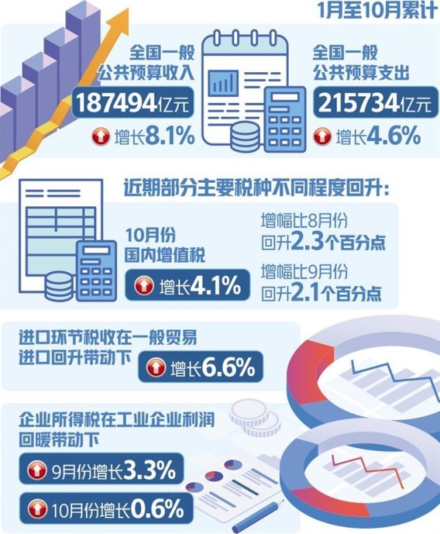 11月15日,財政部發(fā)布統(tǒng)計數(shù)據(jù)顯示,1月至10月累計,全國一般公共預(yù)算收入187494億元,同比增長8.1%;支出215734億元,同比增長4.6%。從總體上看,財政收入保持恢復(fù)性增長,重點領(lǐng)域支出得到有力保障。