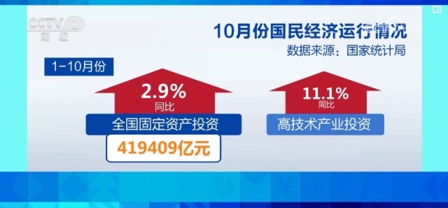 從投資來看,固定資產(chǎn)投資規(guī)模繼續(xù)擴(kuò)大。1—10月份,全國固定資產(chǎn)投資419409億元,同比增長(zhǎng)2.9%。其中,高技術(shù)產(chǎn)業(yè)投資同比增長(zhǎng)11.1%,增長(zhǎng)較快。
